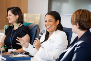 Our incredible opening speaker was Professor Michele Goodwin who grounded us in U.S.’s racist history of reproductive oppression. In her remarks, Professor Goodwin reminded us that the Dobbs decision can be traced back to the days of enslavement when Black women’s bodies were exploited to serve economic goals. She connected history to the present day by showing how language used in advertisements to track down enslaved individuals who had runaway are mirrored in the language of abortion bans. Professor Goodwin closed by sharing that the way to move forward is to acknowledge and understand the footprints of our history. Her moving statements reminded attendees about the critical importance of centering racial and economic justice through a historical lens if we seek to create true progress and not repeat the past.